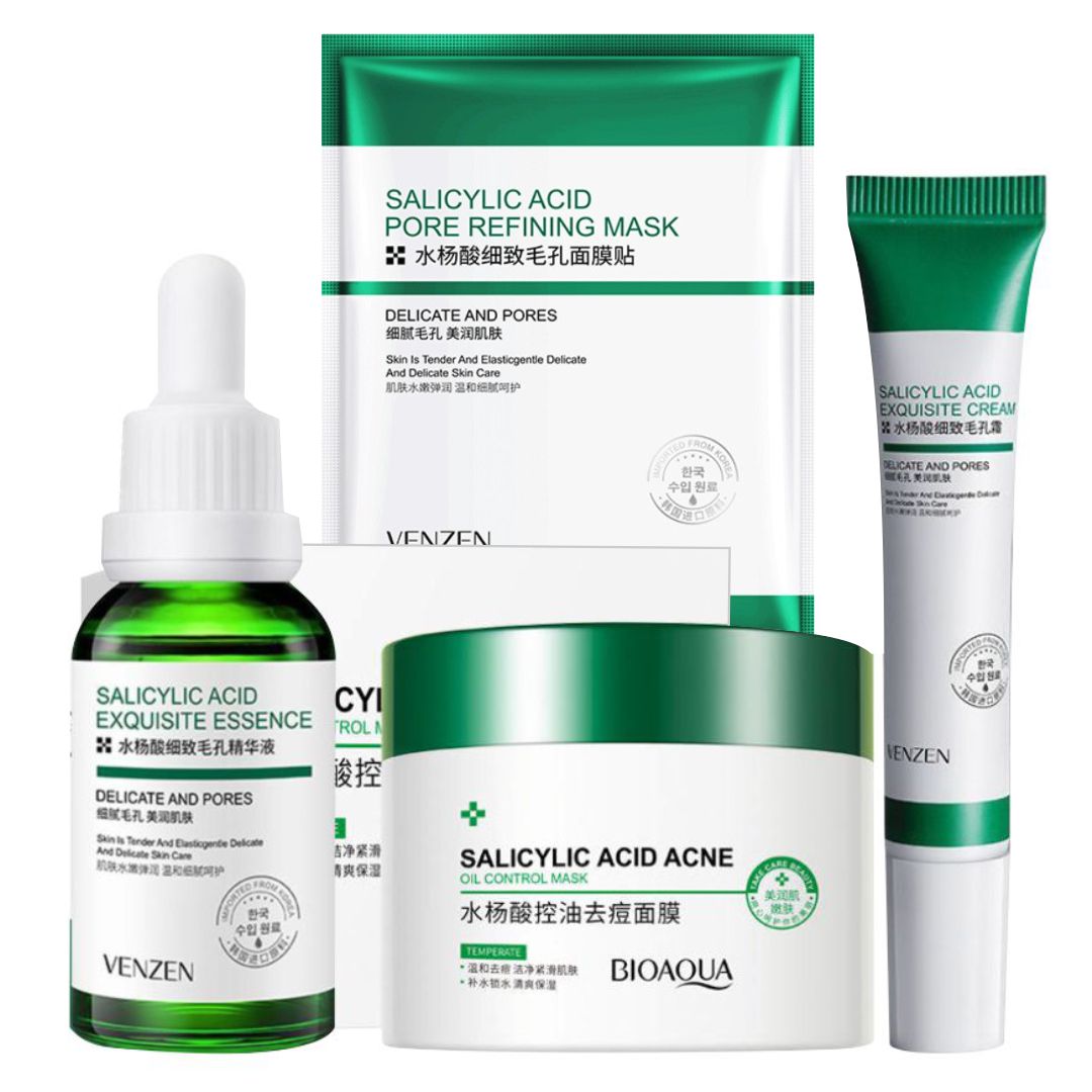 Descubre nuestro revolucionario Kit Facial con Ácido Salicílico: tu aliado en la lucha contra el acné. Con nuestra potente fórmula, podrás decir adiós a los brotes no deseados y darle la bienvenida a una piel clara y radiante. Nuestro kit incluye Pads de Ácido Salicílico para una exfoliación profunda, una Mascarilla Limpiadora que purifica los poros, un Serum Anti Acné para combatir las imperfecciones y una Crema Cicatrizante que acelera la cicatrización. Experimenta la transformación en tu piel y recupera tu confianza. No dejes que el acné te detenga, el poder está en tus manos.